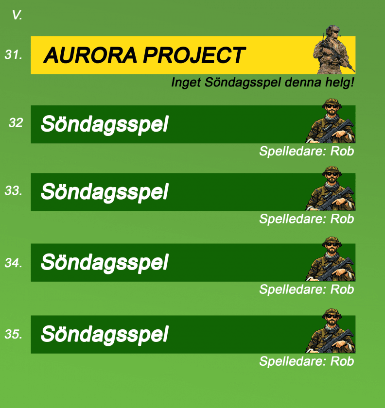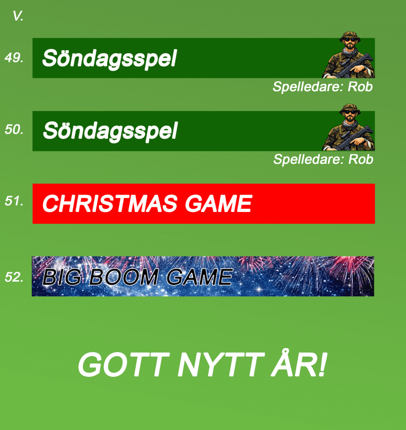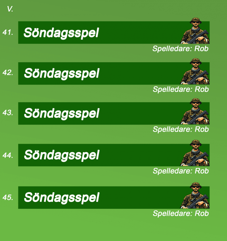 Våra vanliga söndagsspel kan bli utbytta mot specialspel så håll koll på almenackan under hela året, så du inte missar några uppdateringar.