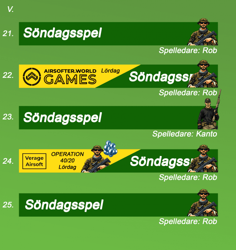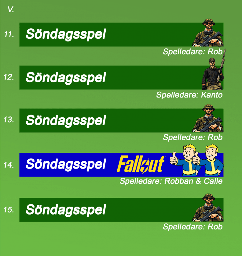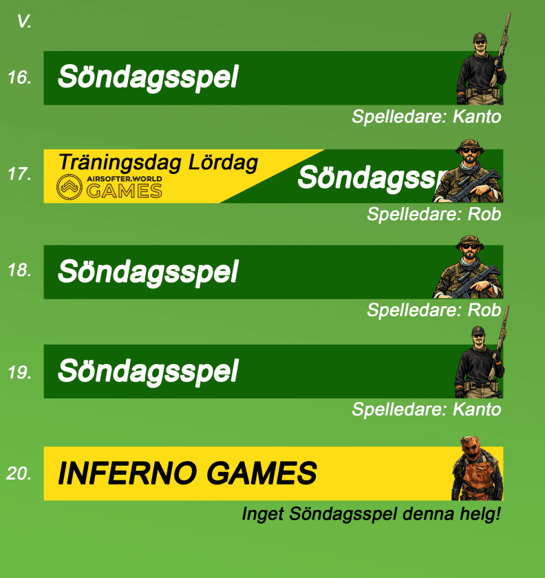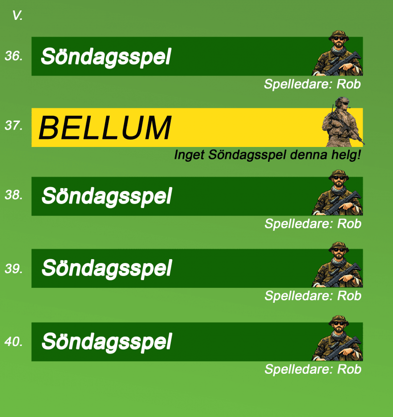 Våra vanliga söndagsspel kan bli utbytta mot specialspel så håll koll på almenackan under hela året, så du inte missar några uppdateringar.