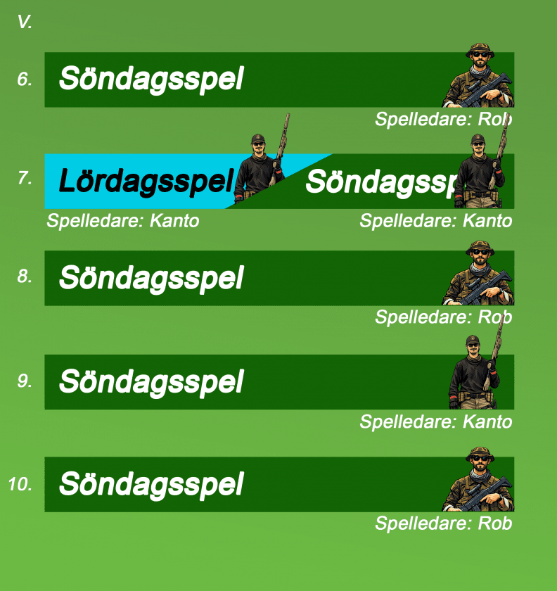 Du kan även se vilken spelledare eller arrangör som annordnar spelet varje helg. Detta för att du som kund ska få ett så varierande spelupplevelse som möjligt.